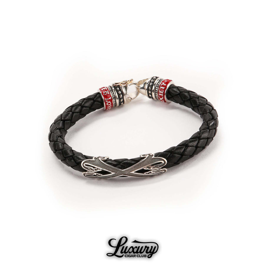 Manny Iriarte, known for his innovation and trendsetting style, brings you a timeless unisex bracelet, individually handcrafted with the finest leather, sterling silver, and 14k gold clasp. An outside-the-box piece that will indeed cause a sensation wherever your travels take you. This beautiful bracelet comes in two colors, black and camel Italian leather. Unique in its design, each piece includes two charms. One charm, depicting Fuente lovers, the other, Fuente The OpusX Society. Both in a vibrant hand-painted red and blue enamel. Together with Cuban Jewelry designer Rudy Santayana and his vast jewelry designing experience, this unique piece will surely be a sensation and a "must-have" accessory to your everyday wardrobe. All pieces are handcrafted in Coral Gables, Florida.
