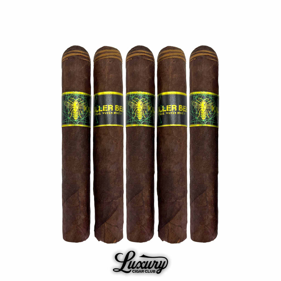 Black Works Studio Killer Bee Cigars are a striking blend of bold flavor and visual artistry. Handmade at the Oveja Negra Factory in Estelí, Nicaragua, these small-batch cigars are instantly recognizable by their signature closed foot and precision-wrapped Connecticut accents on the cap, resembling the distinctive stripes of a killer bee.