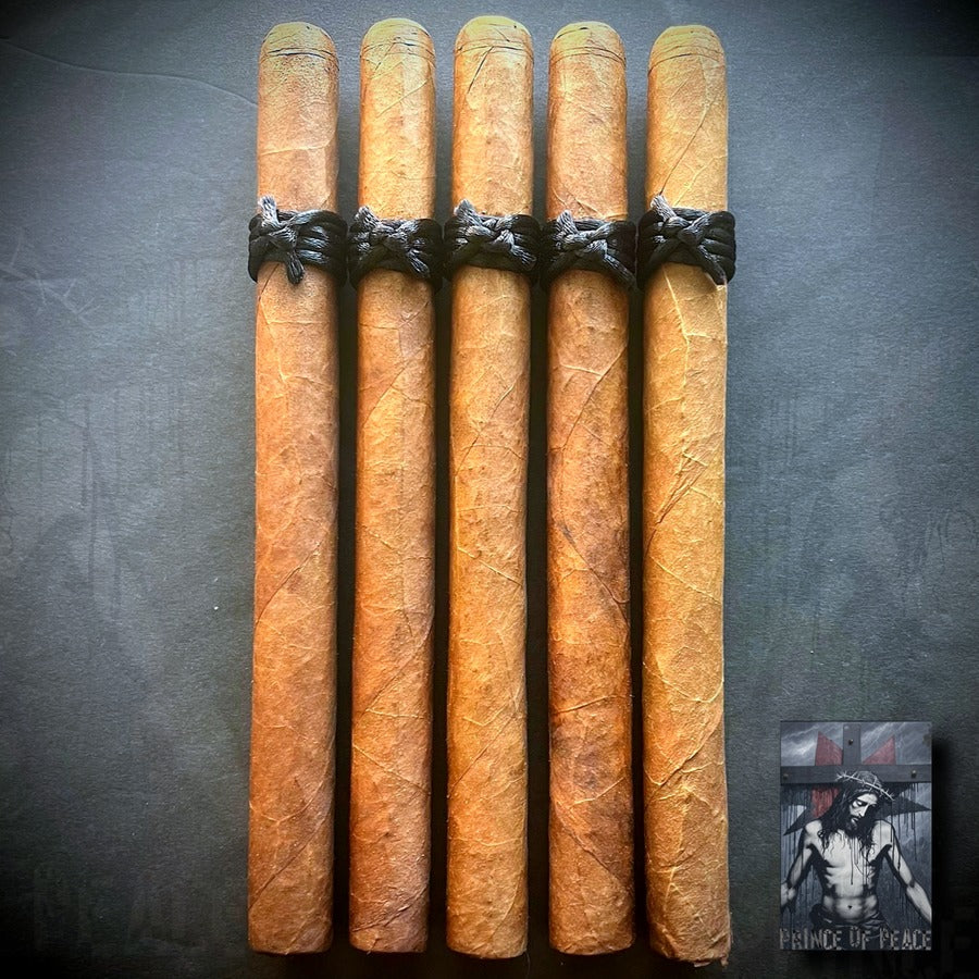 Blessed Leaf PRINCE OF PEACE is a full-bodied, full-strength 7x42 lancero. Wrapper is a jaw-dropping 12-year-aged Colorado wrapper. Binder and filler tobaccos will remain a closely guarded secret. But all tobaccos are 6-13 years aged!