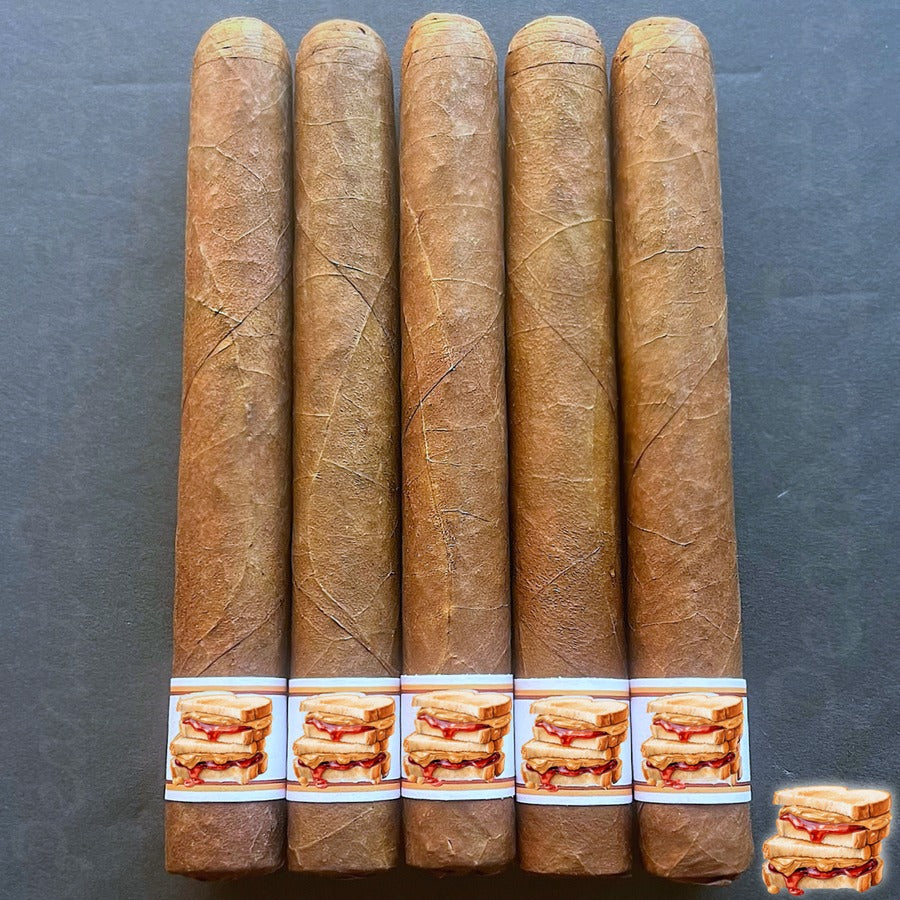 PEANUT BUTTER & JELLY is a full-bodied, med/full-strength 6x50 toro. Wrapper is a luscious 10-year-aged Corojo 99 Rosado. Fillers will remain a very closely guarded secret...but they are all between 5-12 years aged!