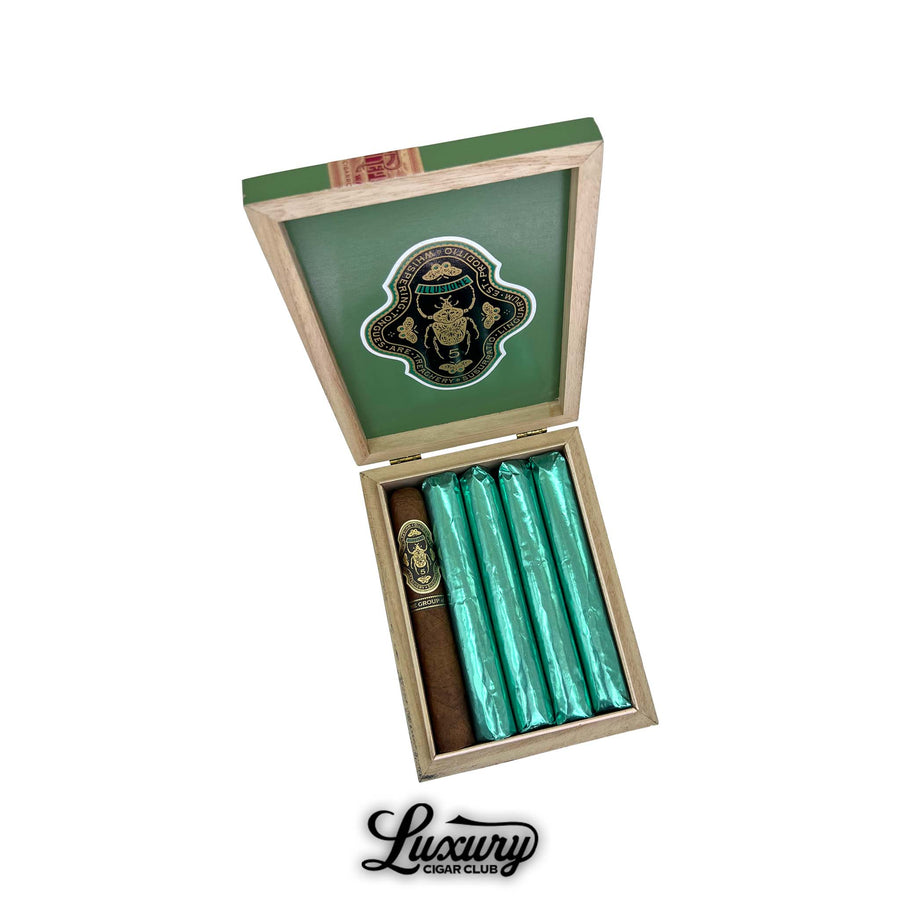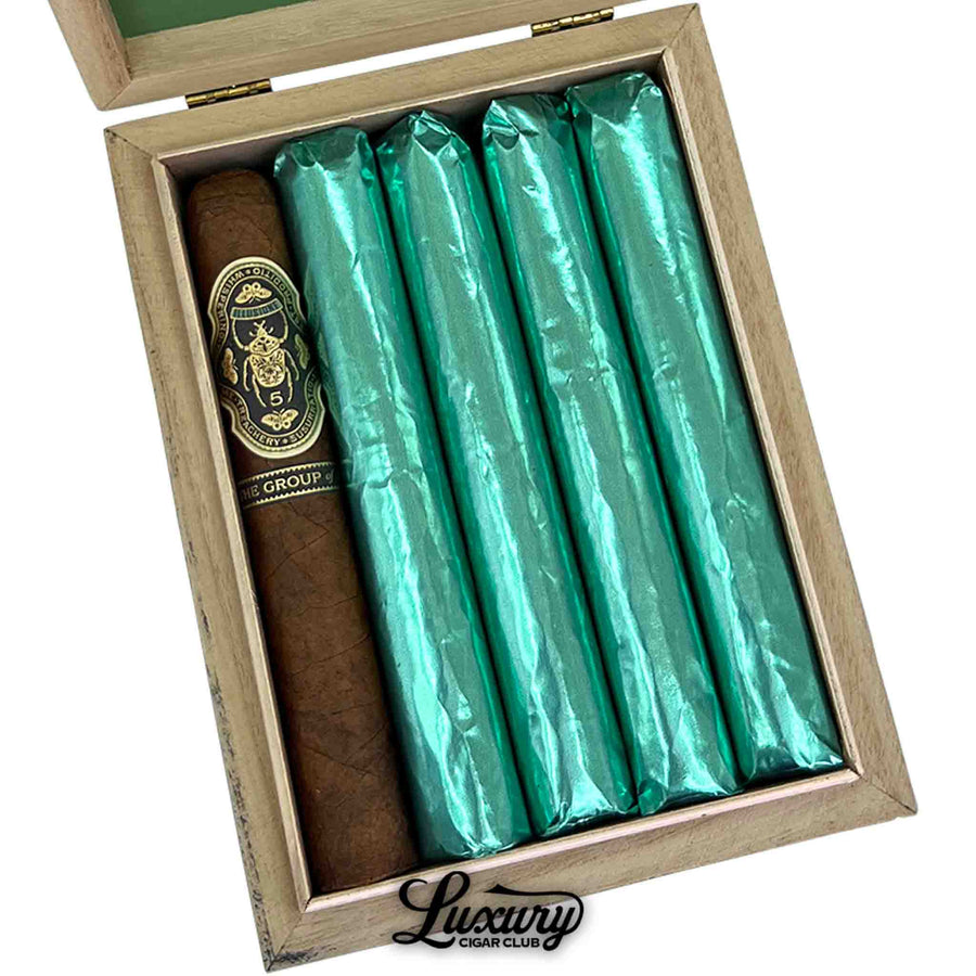 The Group of Five SE is presented in a 6 x 56 Toro Extra, larger than the original 5 x 52 RB release, allowing the blend more room to evolve and deliver added depth while maintaining a medium-bodied profile. Each cigar is wrapped in teal-colored foil and packaged in 15-count boxes, a distinctive presentation rarely used by Illusione and reserved for select releases.