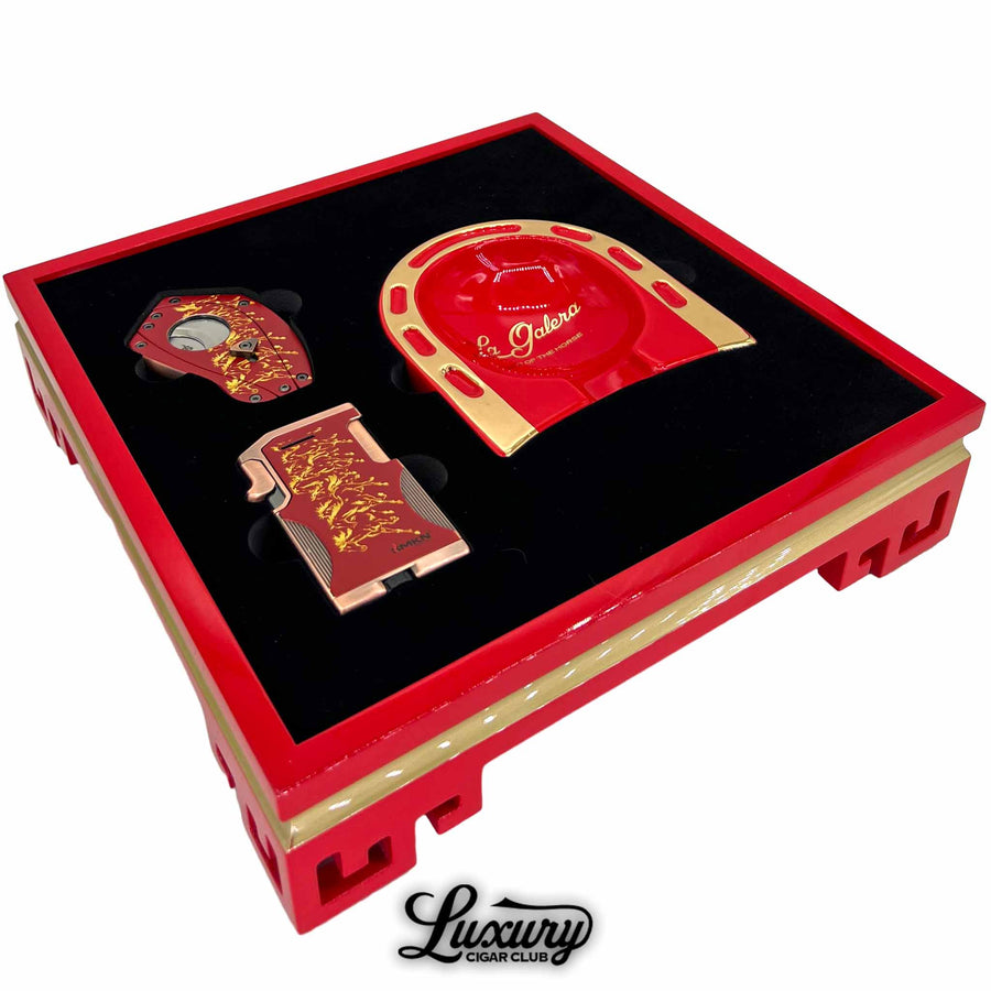 The presentation leans heavily into tradition and luxury, showcasing red and gold packaging symbolizing luck and prosperity, along with detailed horse and palm tree artwork honoring Tabacalera Palma in the Dominican Republic. Each box includes 12 cigars plus three matching accessories: a cutter, lighter, and ashtray, arranged in an intricate four-drawer display.